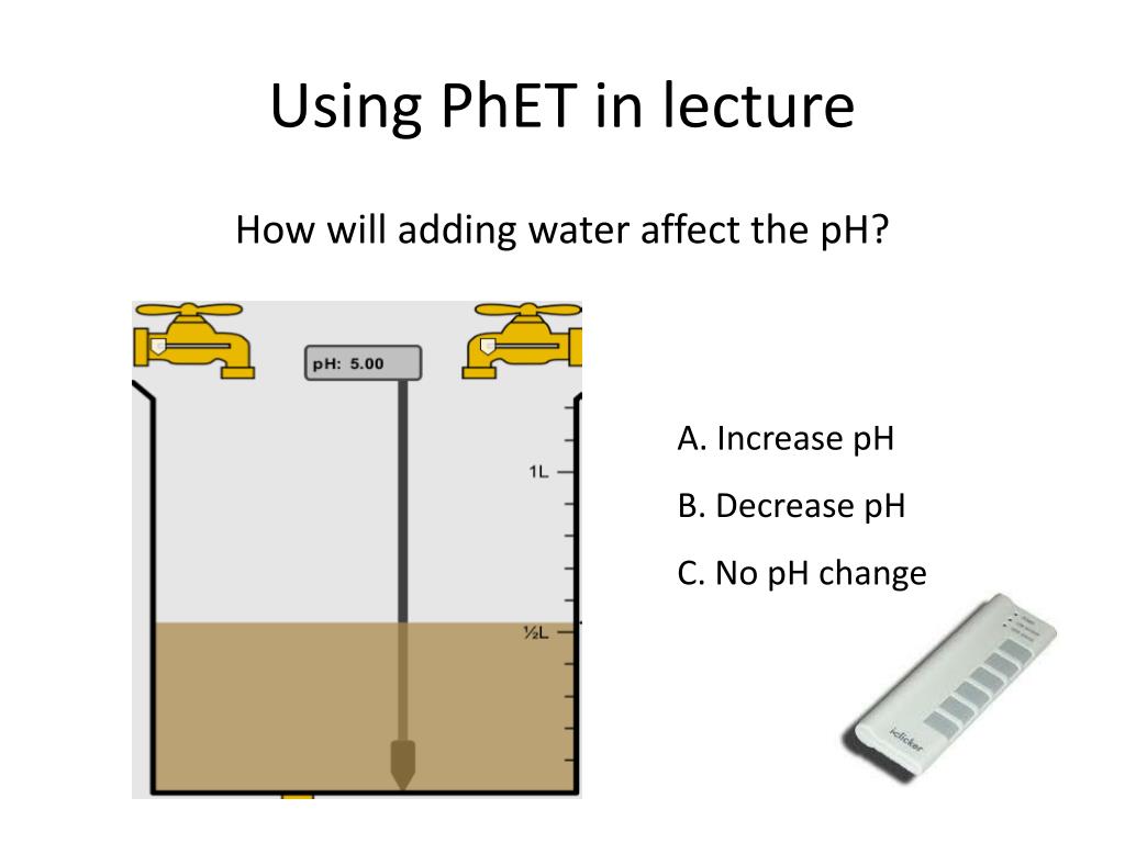 Using PhET in lecture How will adding water affect the pH? Increase pH Decrease pH No pH change