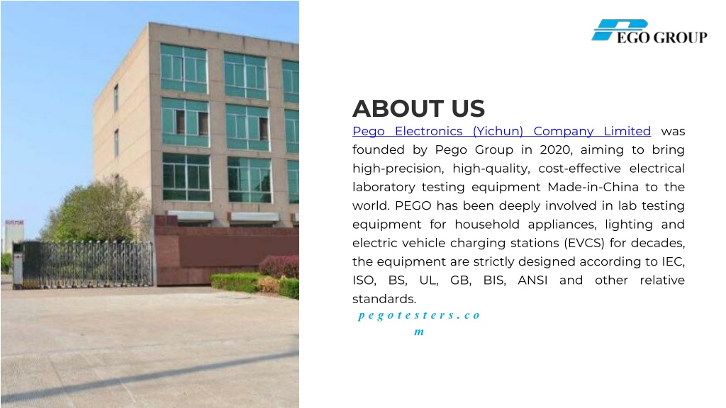 ABOUT US Pego Electronics (Yichun) Company Limited was founded by Pego Group in 2020, aiming to bring high-precision, high-quality, cost-effective electrical laboratory testing equipment Made-in-China to the world. PEGO has been deeply involved in lab testing equipment for household appliances, lighting and electric vehicle charging stations (EVCS) for decades, the equipment are strictly designed according to IEC, ISO, BS, UL, GB, BIS, ANSI and other relative standards. pegotesters.com