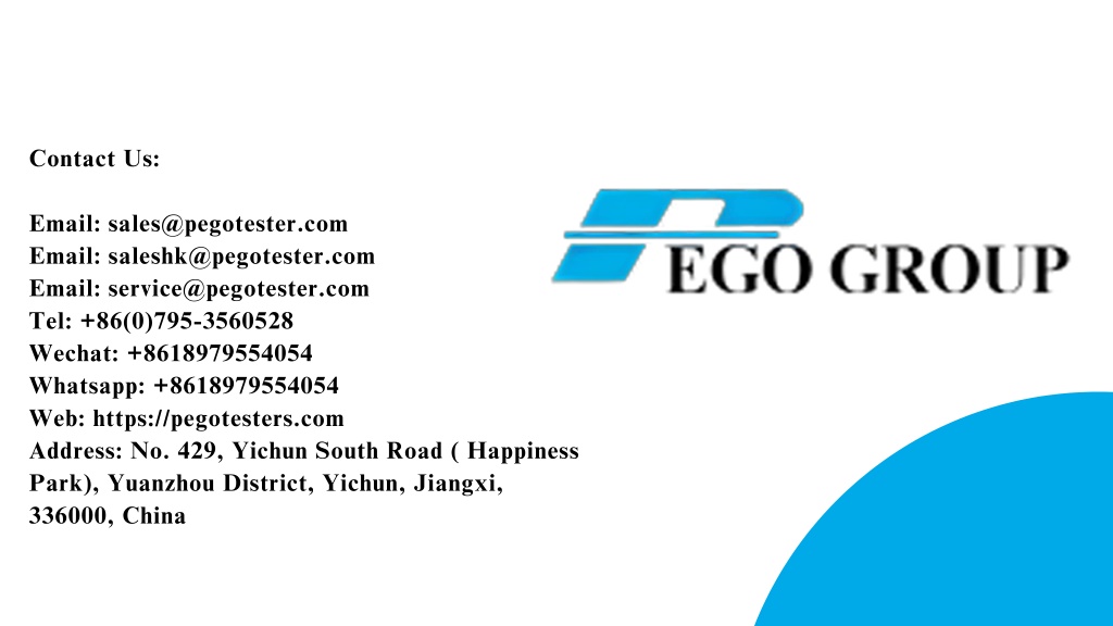 Contact Us: Email: sales@pegotester.com Email: saleshk@pegotester.com Email: service@pegotester.com Tel: +86(0)795-3560528 Wechat: +8618979554054 Whatsapp: +8618979554054 Web: https://pegotesters.com Address: No. 429, Yichun South Road ( Happiness Park), Yuanzhou District, Yichun, Jiangxi, 336000, China