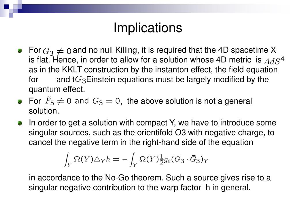 Implications • For and no null Killing, it is required that the 4D spacetime X is flat. Hence, in order to allow for a solution whose 4D metric is as in the KKLT construction by the instanton effect, the field equation for and the Einstein equations must be largely modified by the quantum effect. • For , the above solution is not a general solution. • In order to get a solution with compact Y, we have to introduce some singular sources, such as the orientifold O3with negative charge, to cancel the negative term in the right-hand side of the equation in accordance to the No-Go theorem. Such a source gives rise to a singular negative contribution to the warp factor h in general.