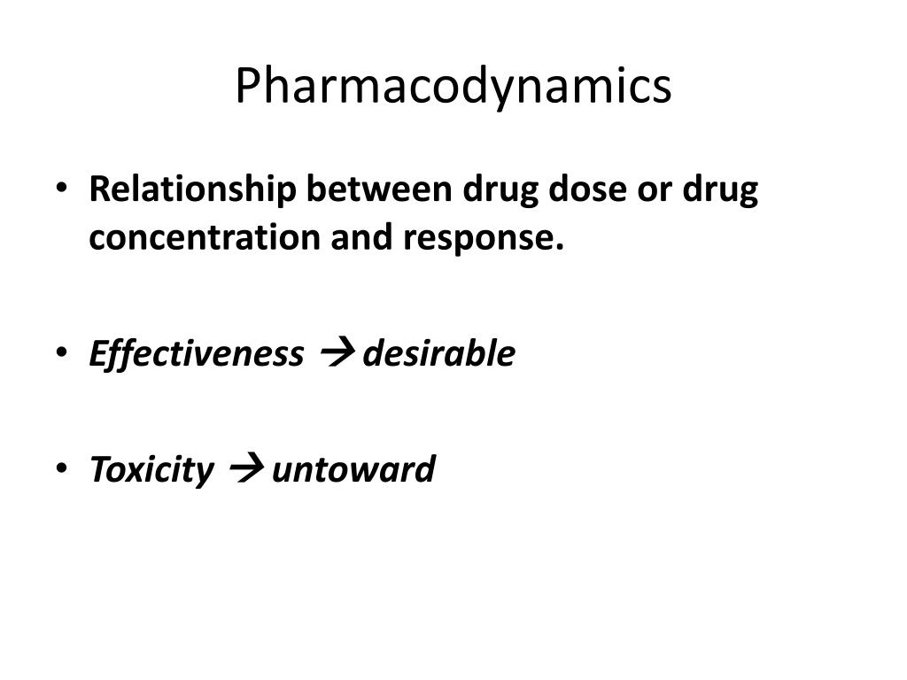 Pharmacodynamics • Relationship between drug dose or drug concentration and response. • Effectiveness desirable • Toxicity untoward