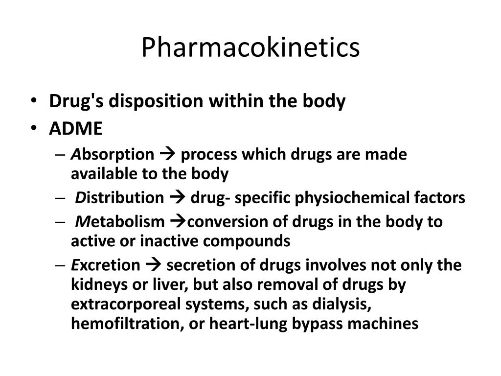 Pharmacokinetics • Drug's disposition within the body • ADME • Absorption process which drugs are made available to the body • Distribution drug- specific physiochemical factors • Metabolism conversion of drugs in the body to active or inactive compounds • Excretion secretion of drugs involves not only the kidneys or liver, but also removal of drugs by extracorporeal systems, such as dialysis, hemofiltration, or heart-lung bypass machines