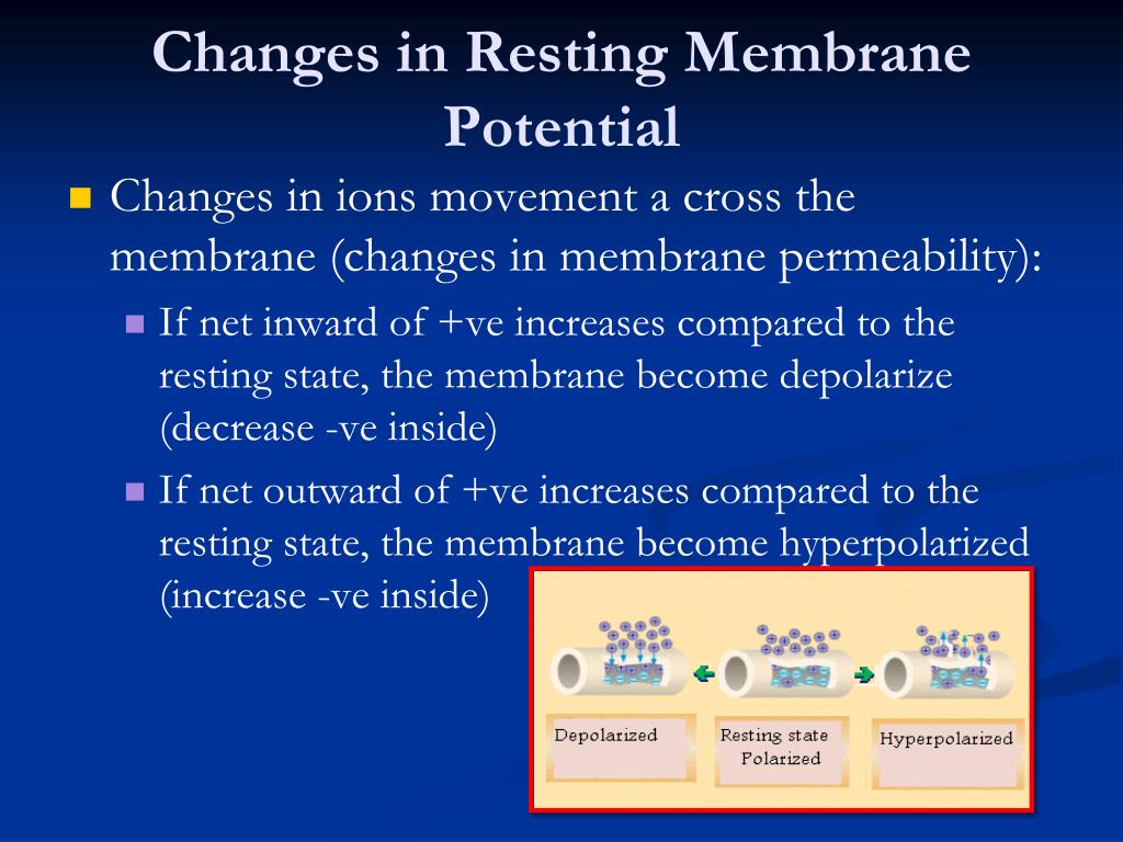 Changes in Resting Membrane Potential Changes in ions movement a cross the membrane (changes in membrane permeability): If net inward of +ve increases compared to the resting state, the membrane become depolarize (decrease -ve inside) If net outward of +ve increases compared to the resting state, the membrane become hyperpolarized (increase -ve inside)