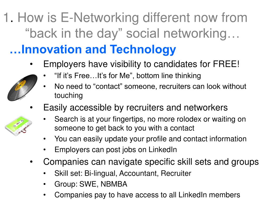 1. How is E-Networking different now from “back in the day” social networking… …Innovation and Technology • Employers have visibility to candidates for FREE! • “If it’s Free…It’s for Me”, bottom line thinking • No need to “contact” someone, recruiters can look without touching • Easily accessible by recruiters and networkers • Search is at your fingertips, no more rolodex or waiting on someone to get back to you with a contact • You can easily update your profile and contact information • Employers can post jobs on LinkedIn • Companies can navigate specific skill sets and groups • Skill set: Bi-lingual, Accountant, Recruiter • Group: SWE, NBMBA • Companies pay to have access to all LinkedIn members