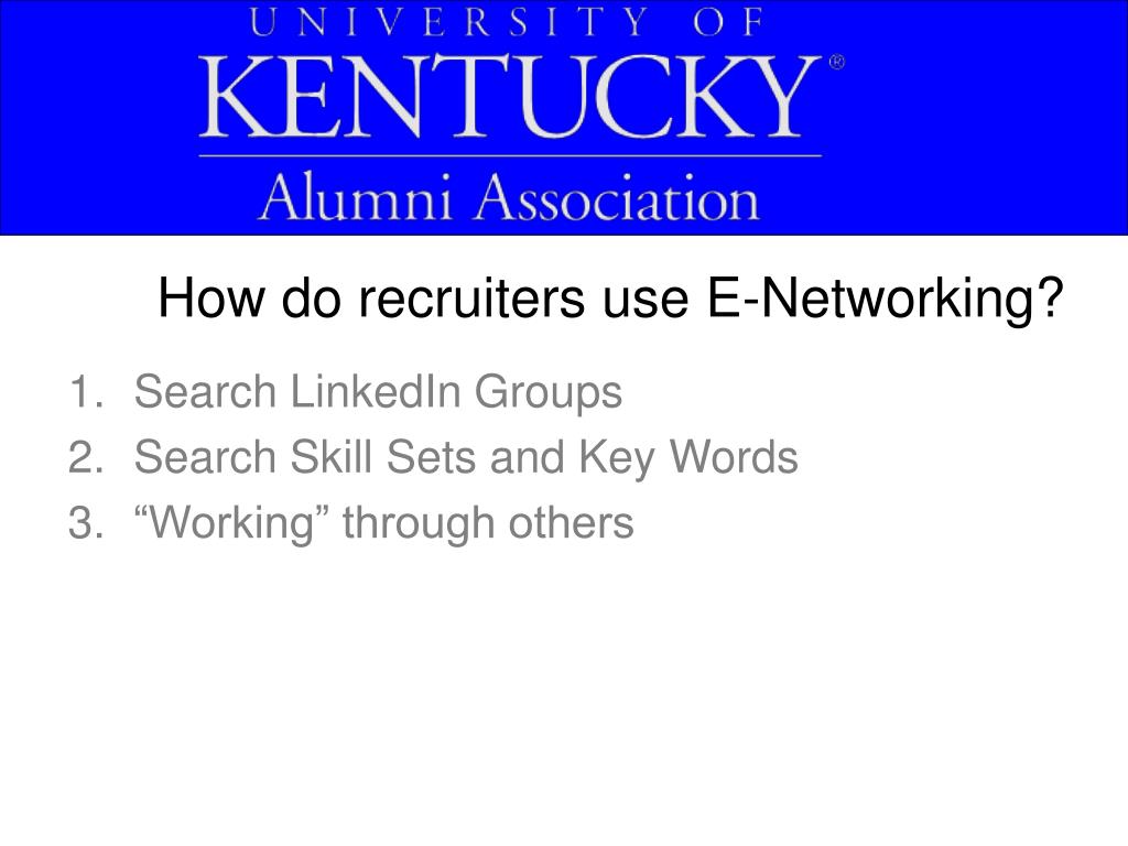 How do recruiters use E-Networking? • Search LinkedIn Groups • Search Skill Sets and Key Words • “Working” through others
