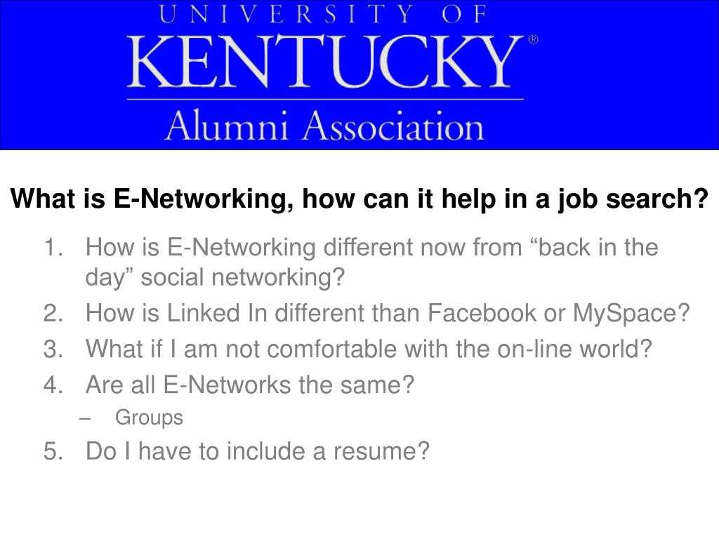 What is E-Networking, how can it help in a job search? • How is E-Networking different now from “back in the day” social networking? • How is Linked In different than Facebook or MySpace? • What if I am not comfortable with the on-line world? • Are all E-Networks the same? • Groups • Do I have to include a resume?