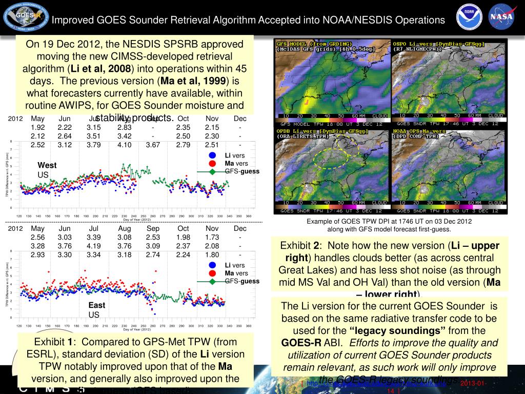 Improved GOES Sounder Retrieval Algorithm Accepted into NOAA/NESDIS Operations On 19 Dec 2012, the NESDIS SPSRB approved moving the new CIMSS-developed retrieval algorithm (Li et al, 2008) into operations within 45 days. The previous version (Ma et al, 1999) is what forecasters currently have available, within routine AWIPS, for GOES Sounder moisture and stability products. 2012 May 1.92 2.12 2.52 Jun 2.22 2.64 3.12 Jul 3.15 3.51 3.79 Aug 2.83 3.42 4.10 Sep - - 3.67 Oct 2.35 2.50 2.79 Nov 2.15 2.30 2.51 Dec - - - West US May 2.56 3.28 2.93 Jun 3.03 3.76 3.30 Jul 3.39 4.19 3.34 Aug 3.08 3.76 3.18 Sep 2.53 3.09 2.74 Oct 1.98 2.37 2.24 Nov 1.73 2.08 1.80 Dec - - - Example of GOES TPW DPI at 1746 UT on 03 Dec 2012 along with GFS model forecast first-guess. 2012 Livers Mavers GFS-guess Livers Mavers GFS-guess Exhibit 2: Note how the new version (Li – upper right) handles clouds better (as across central Great Lakes) and has less shot noise (as through mid MS Val and OH Val) than the old version (Ma – lower right). East US The Li version for the current GOES Sounder is based on the same radiative transfer code to be used for the “legacy soundings” from the GOES-R ABI. Efforts to improve the quality and utilization of current GOES Sounder products remain relevant, as such work will only improve the GOES-R legacy soundings. Exhibit 1: Compared to GPS-Met TPW (from ESRL), standard deviation (SD) of the Li version TPW notably improved upon that of the Ma version, and generally also improved upon the first-guess (GFS based). [ http://cimss.ssec.wisc.edu/goes/rt/exp-work.php 2013-01-14 ]