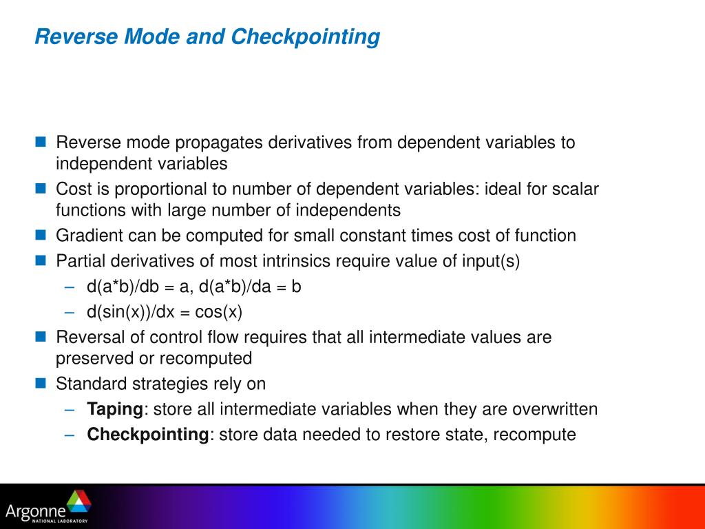Reverse Mode and Checkpointing • Reverse mode propagates derivatives from dependent variables to independent variables • Cost is proportional to number of dependent variables: ideal for scalar functions with large number of independents • Gradient can be computed for small constant times cost of function • Partial derivatives of most intrinsics require value of input(s) • d(a*b)/db = a, d(a*b)/da = b • d(sin(x))/dx = cos(x) • Reversal of control flow requires that all intermediate values are preserved or recomputed • Standard strategies rely on • Taping: store all intermediate variables when they are overwritten • Checkpointing: store data needed to restore state, recompute
