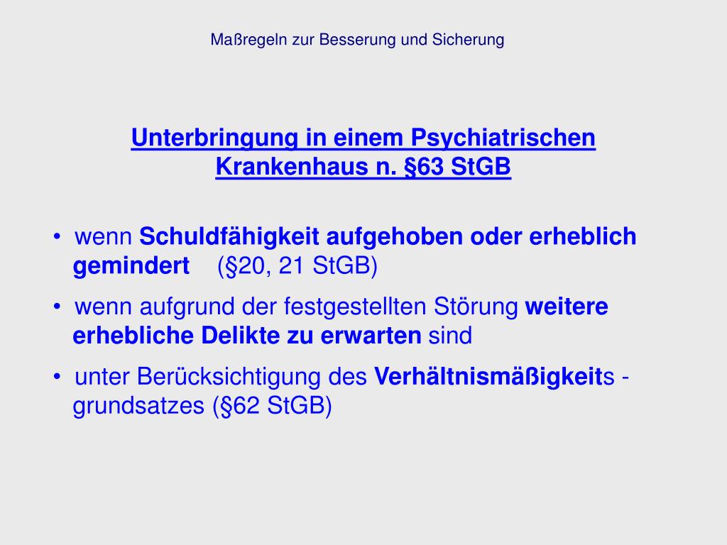 Maßregeln zur Besserung und Sicherung • Unterbringung in einem Psychiatrischen Krankenhaus n. §63 StGB • wenn Schuldfähigkeit aufgehoben oder erheblich gemindert(§20, 21 StGB) • wenn aufgrund der festgestellten Störung weitere erhebliche Delikte zu erwarten sind • unter Berücksichtigung des Verhältnismäßigkeits - grundsatzes (§62 StGB)