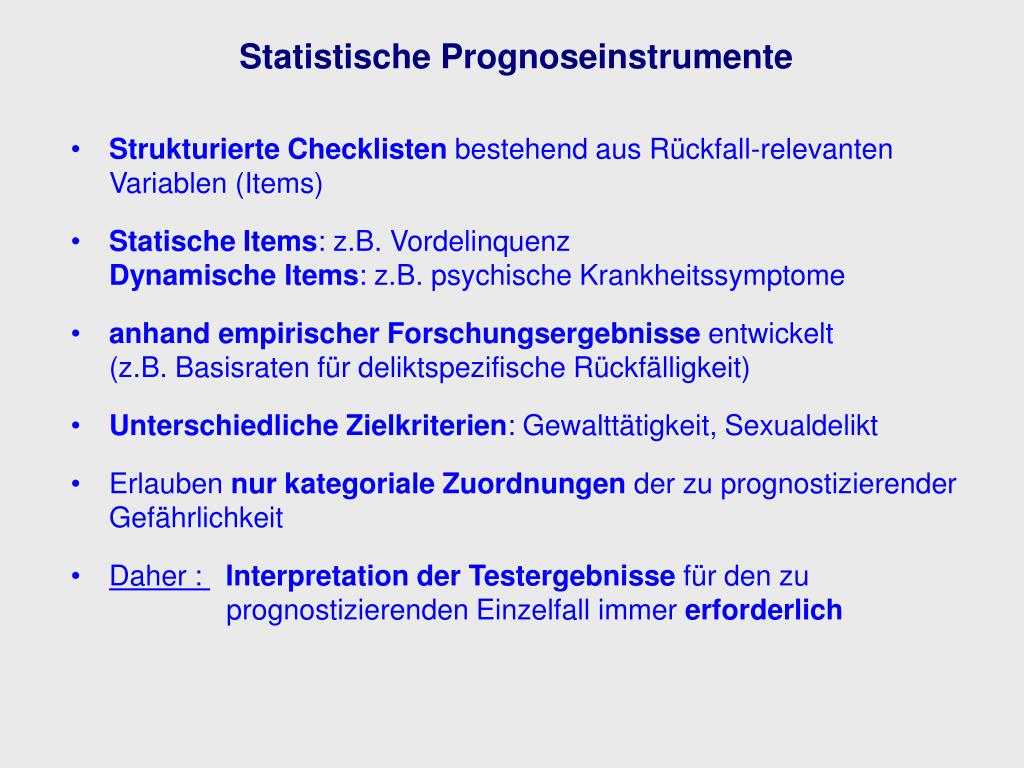 Statistische Prognoseinstrumente • Strukturierte Checklisten bestehend aus Rückfall-relevanten Variablen (Items) • Statische Items: z.B. VordelinquenzDynamische Items: z.B. psychische Krankheitssymptome • anhand empirischer Forschungsergebnisse entwickelt(z.B. Basisraten für deliktspezifische Rückfälligkeit) • Unterschiedliche Zielkriterien: Gewalttätigkeit, Sexualdelikt • Erlauben nur kategoriale Zuordnungen der zu prognostizierender Gefährlichkeit • Daher : Interpretation der Testergebnisse für den zu prognostizierenden Einzelfall immer erforderlich