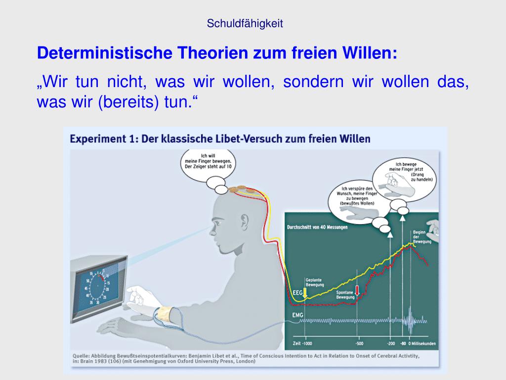 Schuldfähigkeit Deterministische Theorien zum freien Willen: „Wir tun nicht, was wir wollen, sondern wir wollen das, was wir (bereits) tun.“