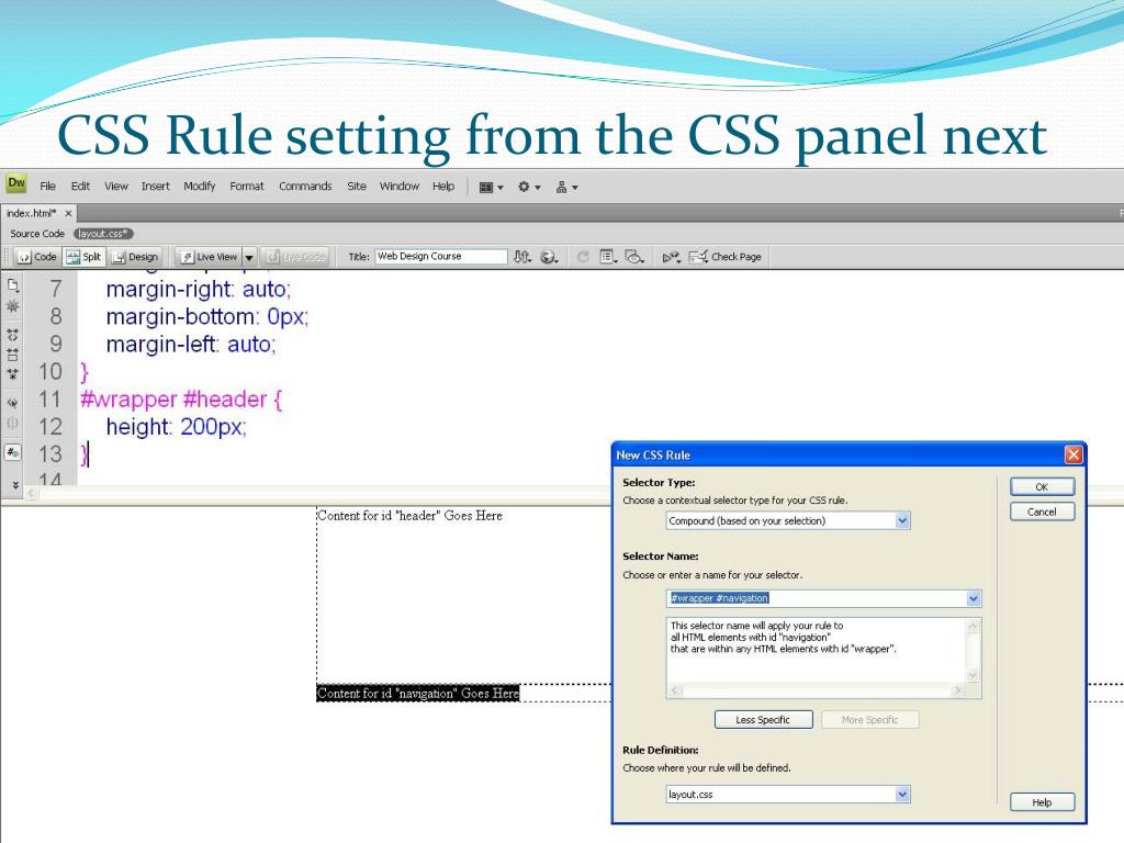 New DIV and Rule for the header The header DIV goes inside the wrapper DIV – insertion before end of the tag