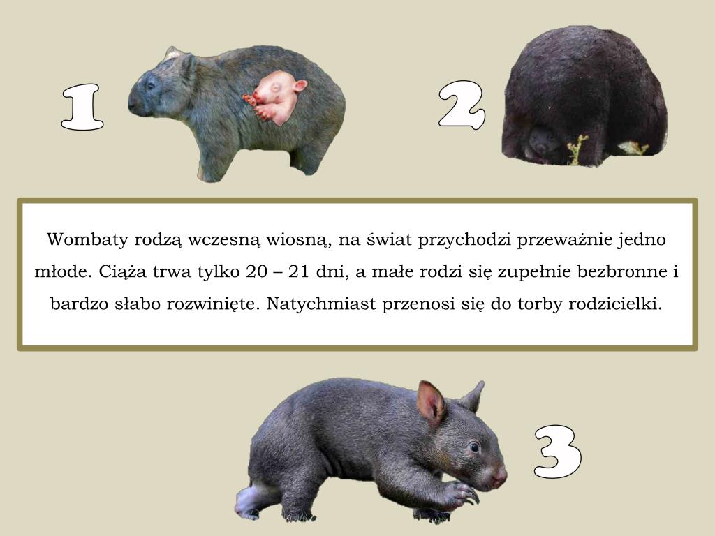 2 1 Wombaty rodzą wczesną wiosną, na świat przychodzi przeważnie jedno młode. Ciąża trwa tylko 20 – 21 dni, a małe rodzi się zupełnie bezbronne i bardzo słabo rozwinięte. Natychmiast przenosi się do torby rodzicielki. 3