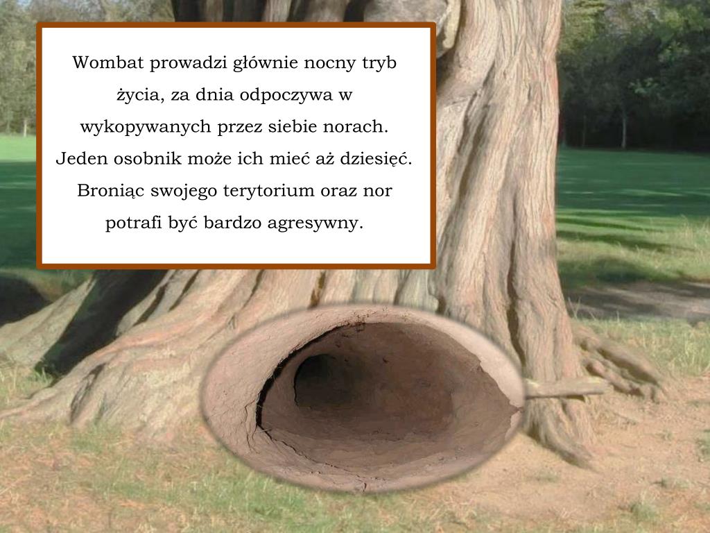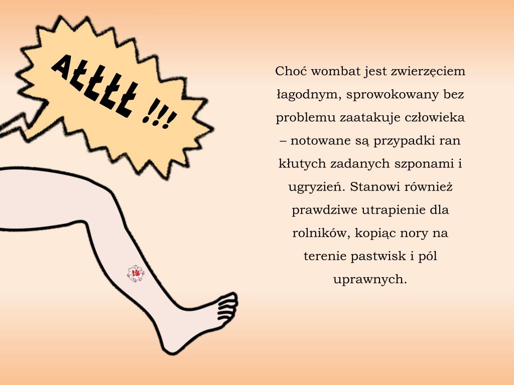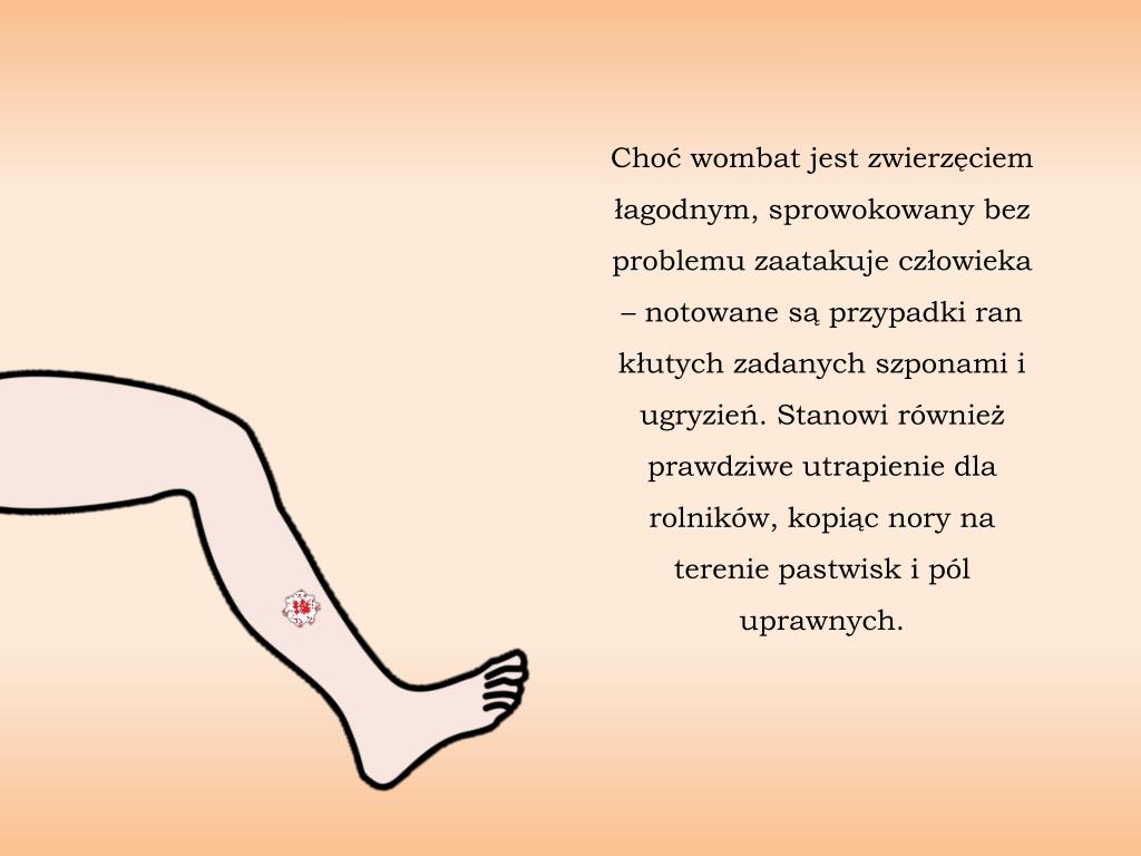 Choć wombat jest zwierzęciem łagodnym, sprowokowany bez problemu zaatakuje człowieka – notowane są przypadki ran kłutych zadanych szponami i ugryzień. Stanowi również prawdziwe utrapienie dla rolników, kopiąc nory na terenie pastwisk i pól uprawnych. AŁŁŁŁ !!!
