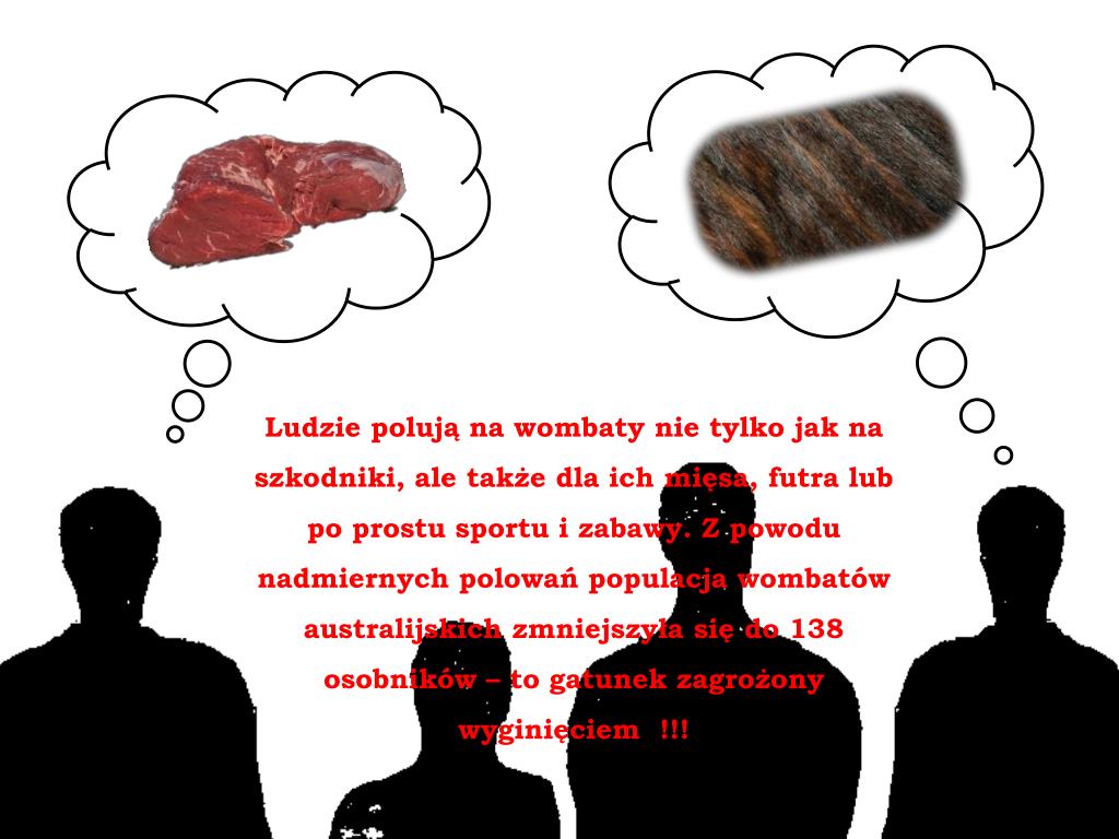 Ludzie polują na wombaty nie tylko jak na szkodniki, ale także dla ich mięsa, futra lub po prostu sportu i zabawy. Z powodu nadmiernych polowań populacja wombatów australijskich zmniejszyła się do 138 osobników – to gatunek zagrożony wyginięciem !!!