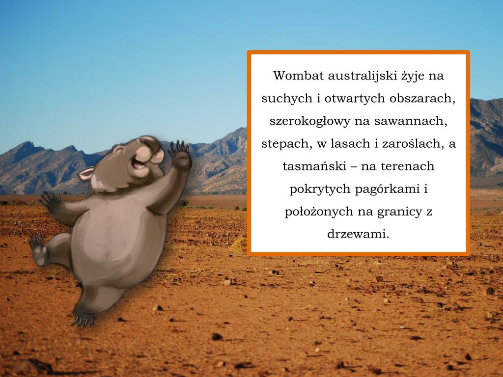 Wombat australijski żyje na suchych i otwartych obszarach, szerokogłowy na sawannach, stepach, w lasach i zaroślach, a tasmański – na terenach pokrytych pagórkami i położonych na granicy z drzewami.