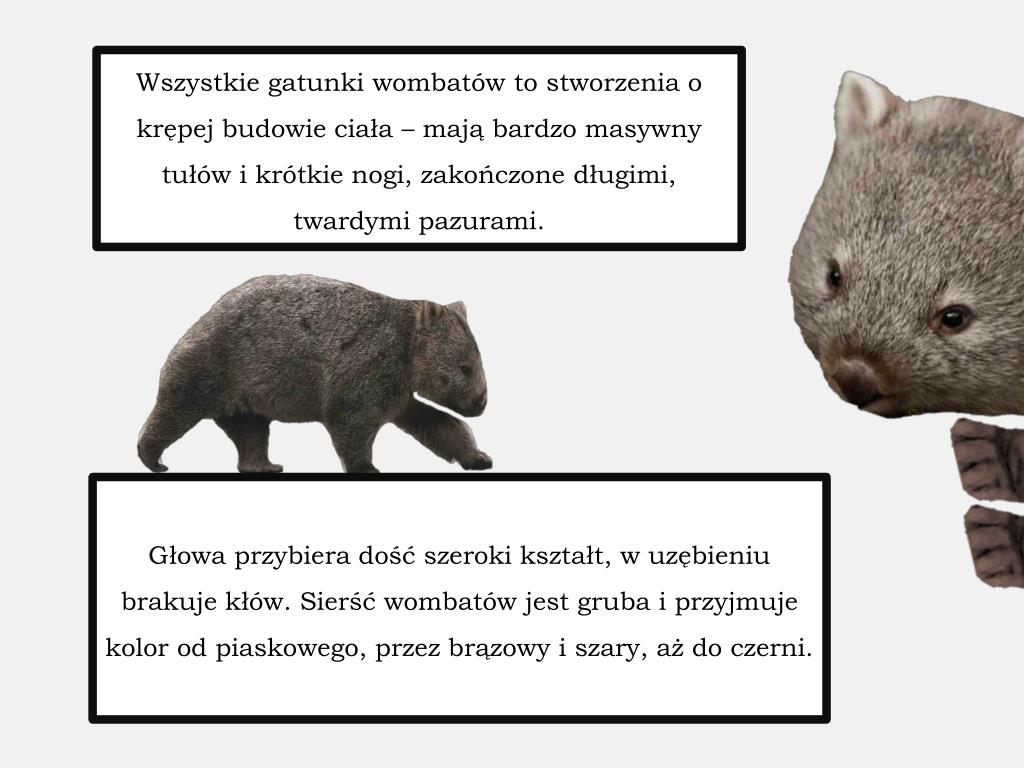 Wombat to obok diabła tasmańskiego i kangura kolejny przedstawiciel torbaczy, będący ssakiem.