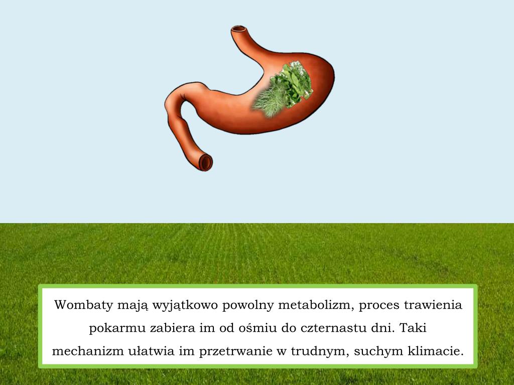 Wombaty mają wyjątkowo powolny metabolizm, proces trawienia pokarmu zabiera im od ośmiu do czternastu dni. Taki mechanizm ułatwia im przetrwanie w trudnym, suchym klimacie.