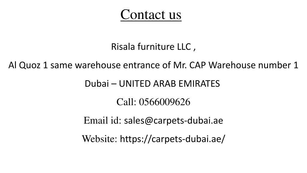 Risala furniture LLC , Al Quoz 1 same warehouse entrance of Mr. CAP Warehouse number 1Dubai – UNITED ARAB EMIRATES Call: 0566009626 Email id: sales@carpets-dubai.ae Website: https://carpets-dubai.ae/ Contact us