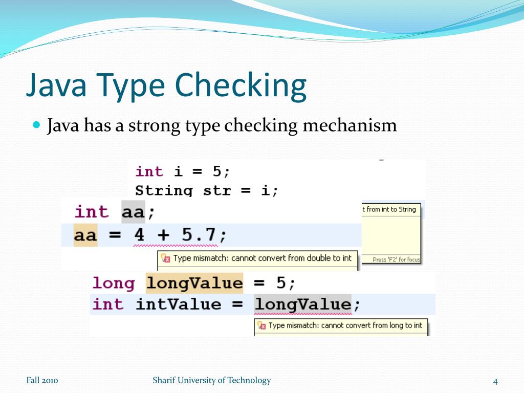 Advanced Programming in Java. Sadegh Aliakbary Sharif University of Technology Fall 2010. Agenda. Type Checking Type Casting Type Conversion toString () method equals() method . Type Safety. The Java language is designed to enforce type safety