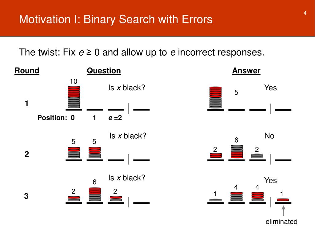 Motivation I: Binary Search with Errors 4 Round Question Answer 10 Is x black? Yes 5 5 1 Position: 0 1 e =2 Is x black? No 6 5 5 2 2 2 Is x black? Yes 6 4 4 2 2 1 1 3 eliminated The twist: Fix e≥ 0 and allow up to e incorrect responses.
