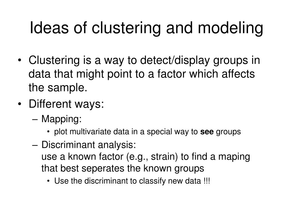 Ideas of clustering and modeling • Clustering is a way to detect/display groups in data that might point to a factor which affects the sample. • Different ways: • Mapping: • plot multivariate data in a special way to see groups • Discriminant analysis:use a known factor (e.g., strain) to find a maping that best seperates the known groups • Use the discriminant to classify new data !!!