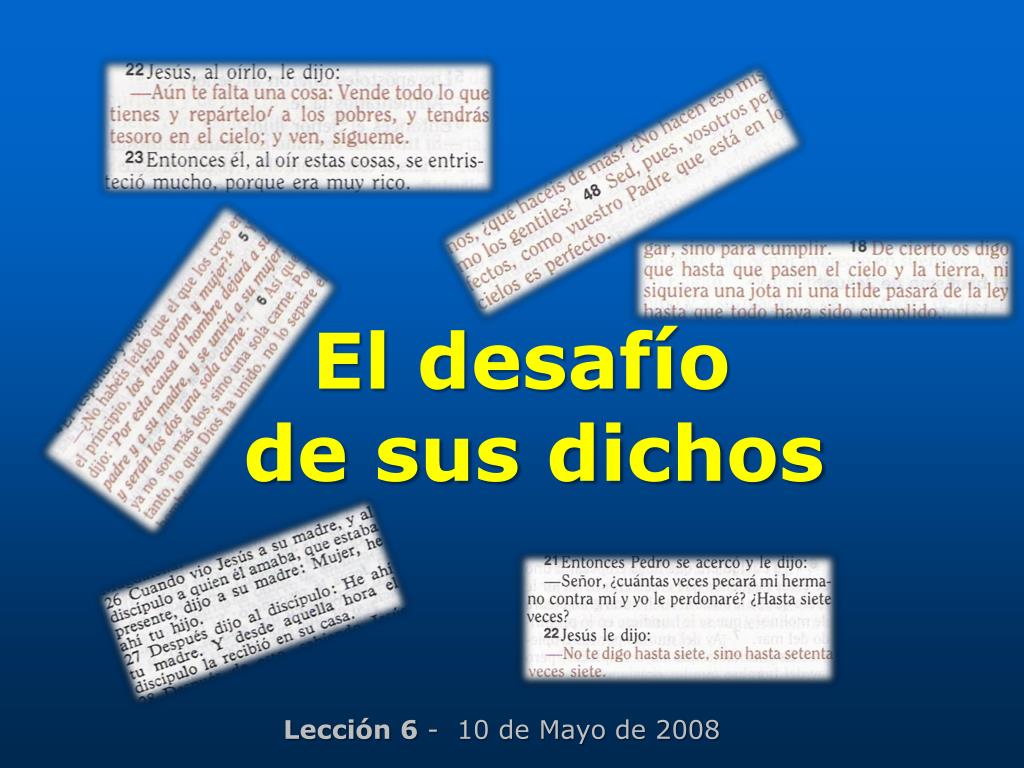 El desafío de sus dichos. Lección 6 - 10 de Mayo de 2008. Objetivos de la lección. Saber que muchas de las cosas que Jesús dijo no estaban en armonía con las normas de su tiempo. Sentir que la necesidad de aplicar los principios encerrados en las palabras de Jesús a nuestra vida diaria.