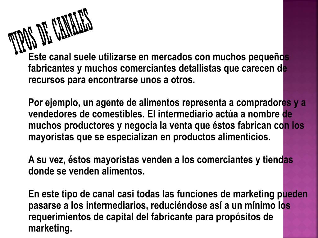 TIPOS DE CANALES Este canal suele utilizarse en mercados con muchos pequeños fabricantes y muchos comerciantes detallistas que carecen de recursos para encontrarse unos a otros. Por ejemplo, un agente de alimentos representa a compradores y a vendedores de comestibles. El intermediario actúa a nombre de muchos productores y negocia la venta que éstos fabrican con los mayoristas que se especializan en productos alimenticios. A su vez, éstos mayoristas venden a los comerciantes y tiendas donde se venden alimentos. En este tipo de canal casi todas las funciones de marketing pueden pasarse a los intermediarios, reduciéndose así a un mínimo los requerimientos de capital del fabricante para propósitos de marketing.