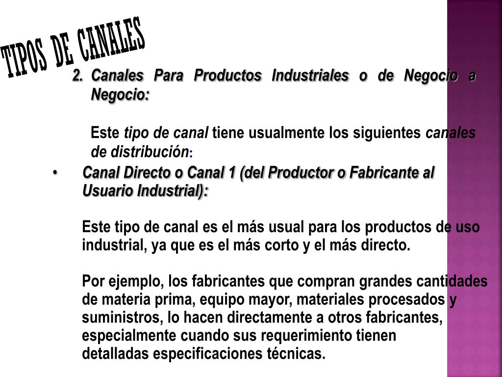 TIPOS DE CANALES • Canales Para Productos Industriales o de Negocio a Negocio: • Este tipo de canal tiene usualmente los siguientes canales de distribución: • Canal Directo o Canal 1 (del Productor o Fabricante al Usuario Industrial): • Este tipo de canal es el más usual para los productos de uso industrial, ya que es el más corto y el más directo. • Por ejemplo, los fabricantes que compran grandes cantidades de materia prima, equipo mayor, materiales procesados y suministros, lo hacen directamente a otros fabricantes, especialmente cuando sus requerimiento tienen • detalladas especificaciones técnicas.