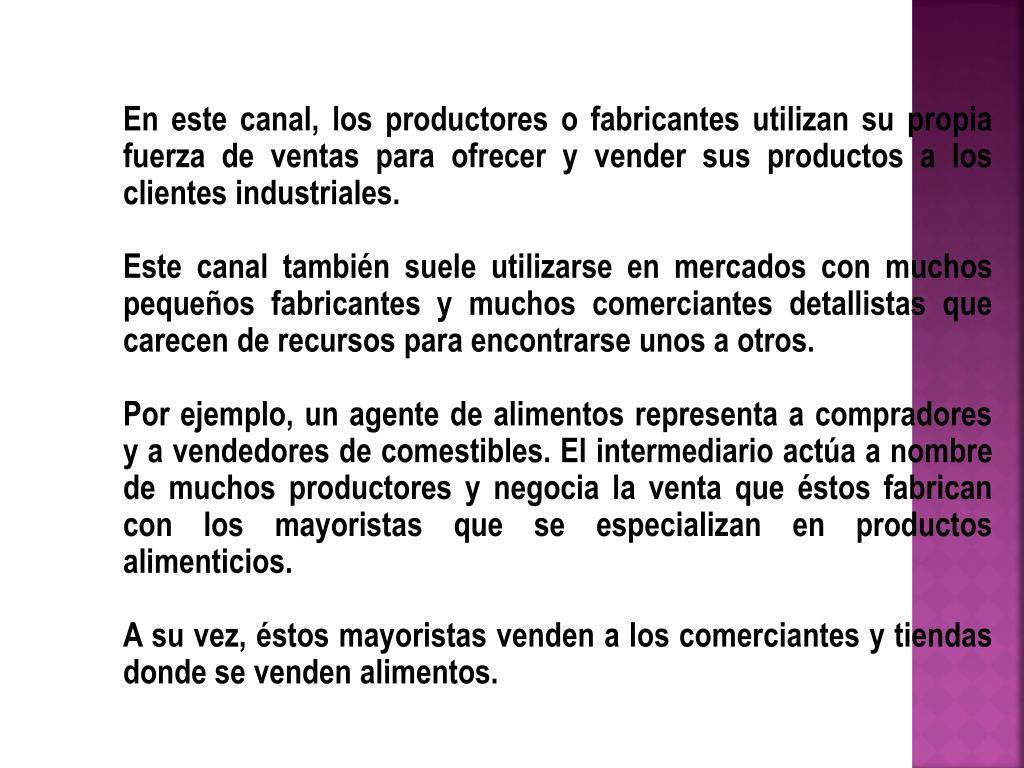 En este canal, los productores o fabricantes utilizan su propia fuerza de ventas para ofrecer y vender sus productos a los clientes industriales. Este canal también suele utilizarse en mercados con muchos pequeños fabricantes y muchos comerciantes detallistas que carecen de recursos para encontrarse unos a otros. Por ejemplo, un agente de alimentos representa a compradores y a vendedores de comestibles. El intermediario actúa a nombre de muchos productores y negocia la venta que éstos fabrican con los mayoristas que se especializan en productos alimenticios. A su vez, éstos mayoristas venden a los comerciantes y tiendas donde se venden alimentos.
