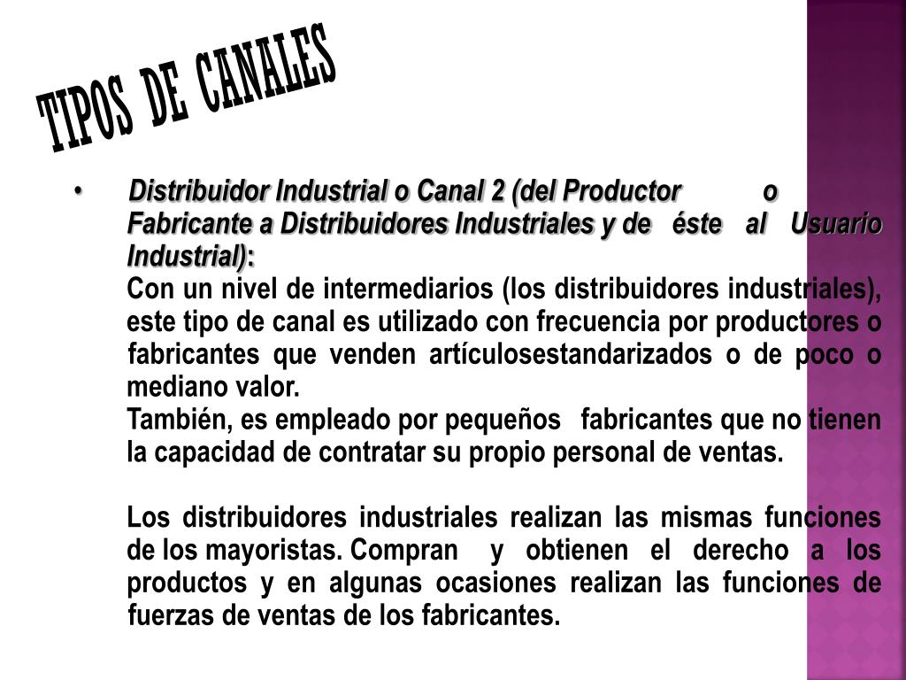 TIPOS DE CANALES • Distribuidor Industrial o Canal 2 (del Productor o Fabricante a Distribuidores Industriales y de éste al Usuario Industrial): • Con un nivel de intermediarios (los distribuidores industriales), este tipo de canal es utilizado con frecuencia por productores o fabricantes que venden artículosestandarizadoso de poco o mediano valor. • También, es empleado por pequeños fabricantes que no tienen la capacidad de contratar su propio personal de ventas. • Los distribuidores industriales realizan las mismas funciones de los mayoristas. Compran y obtienen el derecho a los productos y en algunas ocasiones realizan las funciones de fuerzas de ventas de los fabricantes.
