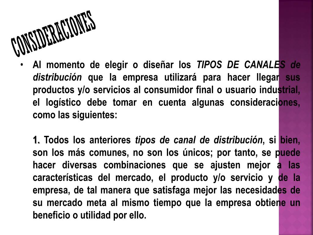 CONSIDERACIONES • Al momento de elegir o diseñar los TIPOS DE CANALES de distribución que la empresa utilizará para hacer llegar sus productos y/o servicios al consumidor final o usuario industrial, el logístico debe tomar en cuenta algunas consideraciones, como las siguientes: • 1. Todos los anteriores tipos de canal de distribución, si bien, son los más comunes, no son los únicos; por tanto, se puede hacer diversas combinaciones que se ajusten mejor a las características del mercado, el producto y/o servicio y de la empresa, de tal manera que satisfaga mejor las necesidades de su mercado meta al mismo tiempo que la empresa obtiene un beneficio o utilidad por ello.