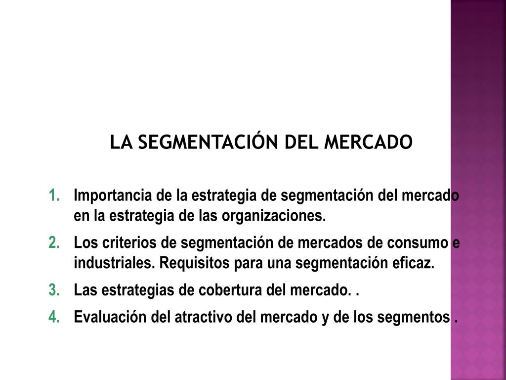 LA SEGMENTACIÓN DEL MERCADO Importancia de la estrategia de segmentación del mercado en la estrategia de las organizaciones. Los criterios de segmentación de mercados de consumo e industriales. Requisitos para una segmentación eficaz. Las estrategias de cobertura del mercado.. Evaluación del atractivo del mercado y de los segmentos.