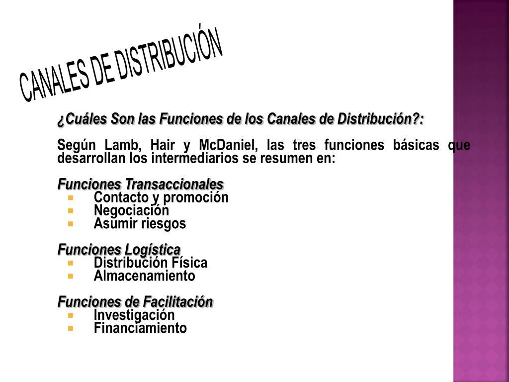 CANALES DE DISTRIBUCIÓN ¿Cuáles Son las Funciones de los Canales de Distribución?: Según Lamb, Hair y McDaniel, las tres funciones básicas que desarrollan los intermediarios se resumen en: Funciones Transaccionales • Contacto y promoción • Negociación • Asumir riesgos Funciones Logística • Distribución Física • Almacenamiento Funciones de Facilitación • Investigación • Financiamiento