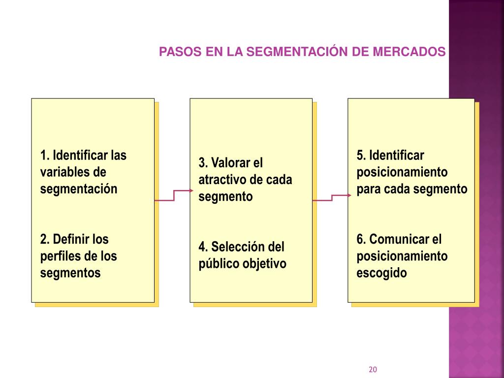 1. Identificar las variables de segmentación 2. Definir los perfiles de los segmentos 3. Valorar el atractivo de cada segmento 4. Selección del público objetivo 5. Identificar posicionamiento para cada segmento 6. Comunicar el posicionamiento escogido PASOS EN LA SEGMENTACIÓN DE MERCADOS