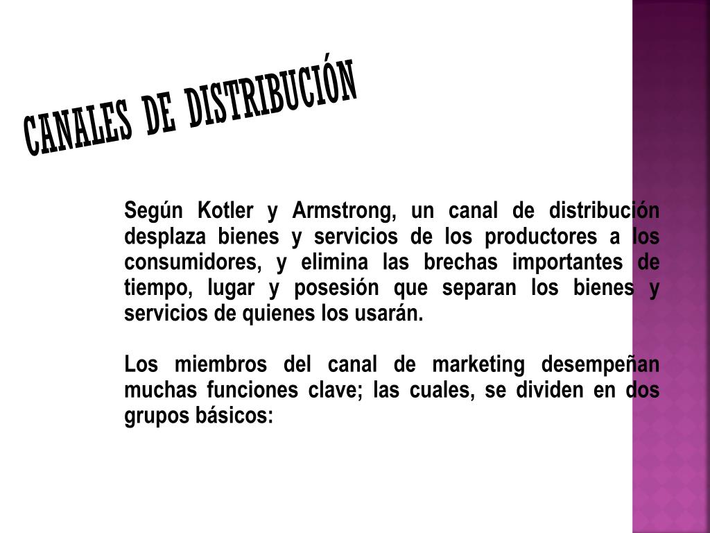 CANALES DE DISTRIBUCIÓN Según Kotler y Armstrong, un canal de distribución desplaza bienes y servicios de los productores a los consumidores, y elimina las brechas importantes de tiempo, lugar y posesión que separan los bienes y servicios de quienes los usarán. Los miembros del canal de marketing desempeñan muchas funciones clave; las cuales, se dividen en dos grupos básicos: