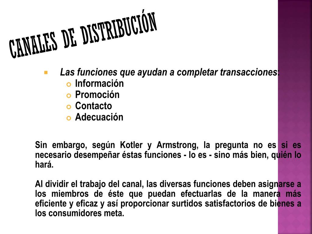 CANALES DE DISTRIBUCIÓN • Las funciones que ayudan a completar transacciones: • Información • Promoción • Contacto • Adecuación Sin embargo, según Kotler y Armstrong, la pregunta no es si es necesario desempeñar éstas funciones - lo es - sino más bien, quién lo hará. Al dividir el trabajo del canal, las diversas funciones deben asignarse a los miembros de éste que puedan efectuarlas de la manera más eficiente y eficaz y así proporcionar surtidos satisfactorios de bienes a los consumidores meta.