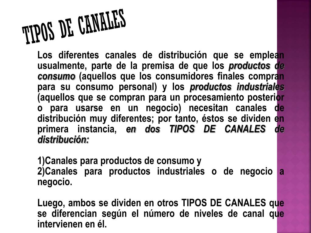 TIPOS DE CANALES Los diferentes canales de distribución que se emplean usualmente, parte de la premisa de que los productos de consumo (aquellos que los consumidores finales compran para su consumo personal) y los productos industriales (aquellos que se compran para un procesamiento posterior o para usarse en un negocio) necesitan canales de distribución muy diferentes; por tanto, éstos se dividen en primera instancia, en dos TIPOS DE CANALES de distribución: 1)Canales para productos de consumo y 2)Canales para productos industriales o de negocio a negocio. Luego, ambos se dividen en otros TIPOS DE CANALES que se diferencian según el número de niveles de canal que intervienen en él.