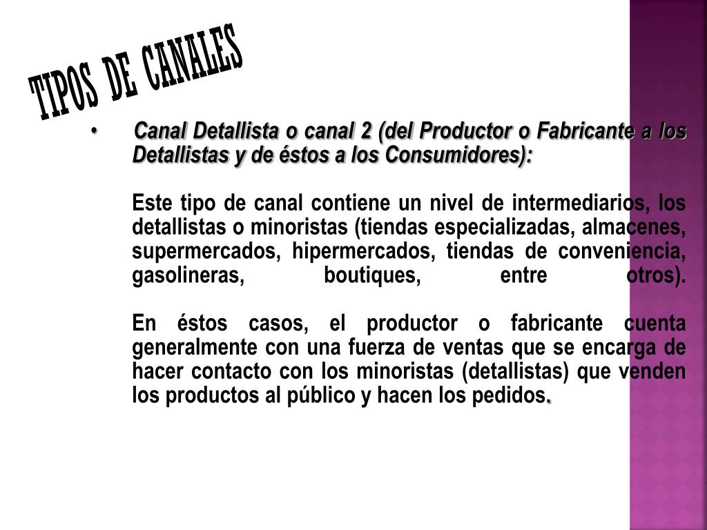 TIPOS DE CANALES • Canal Detallista o canal 2 (del Productor o Fabricante a los Detallistas y de éstos a los Consumidores): • Este tipo de canal contiene un nivel de intermediarios, los detallistas o minoristas (tiendas especializadas, almacenes, supermercados, hipermercados, tiendas de conveniencia, gasolineras, boutiques, entre otros). • En éstos casos, el productor o fabricante cuenta generalmente con una fuerza de ventas que se encarga de hacer contacto con los minoristas (detallistas) que venden los productos al público y hacen los pedidos.
