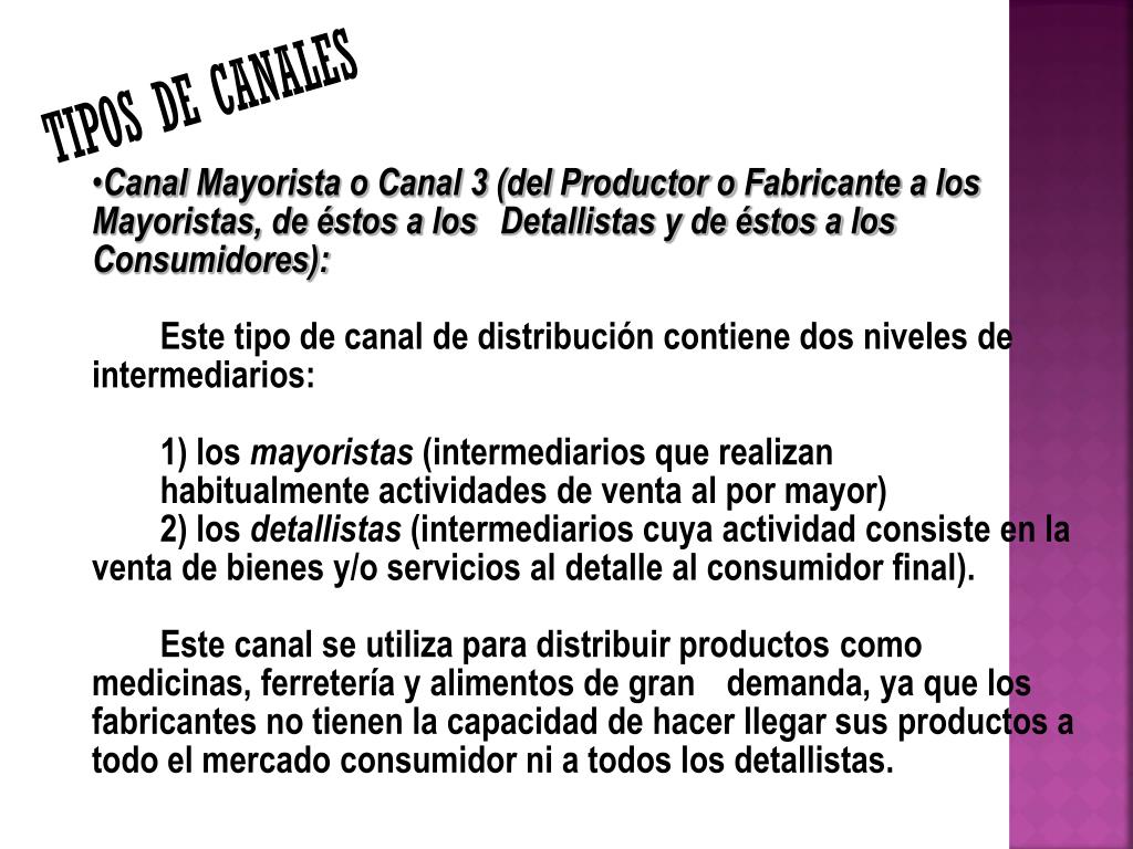 TIPOS DE CANALES • Canal Mayorista o Canal 3 (del Productor o Fabricante a los Mayoristas, de éstos a los Detallistas y de éstos a los Consumidores): • Este tipo de canal de distribución contiene dos niveles de intermediarios: • 1) los mayoristas (intermediarios que realizan habitualmente actividades de venta al por mayor) • 2) los detallistas (intermediarios cuya actividad consiste en la venta de bienes y/o servicios al detalle al consumidor final). • Este canal se utiliza para distribuir productos como medicinas, ferretería y alimentos de gran demanda, ya que los fabricantes no tienen la capacidad de hacer llegar sus productos a todo el mercado consumidor ni a todos los detallistas.