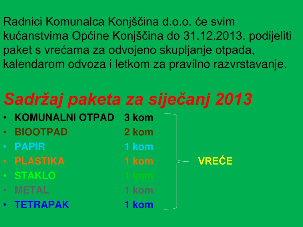 Radnici Komunalca Konjščina d.o.o. će svim kućanstvima Općine Konjščina do 31.12.2013. podijeliti paket s vrećama za odvojeno skupljanje otpada, kalendarom odvoza i letkom za pravilno razvrstavanje. Sadržaj paketa za siječanj 2013 • KOMUNALNI OTPAD 3 kom • BIOOTPAD 2 kom • PAPIR 1 kom • PLASTIKA 1 kom VREĆE • STAKLO 1 kom • METAL 1 kom • TETRAPAK 1 kom