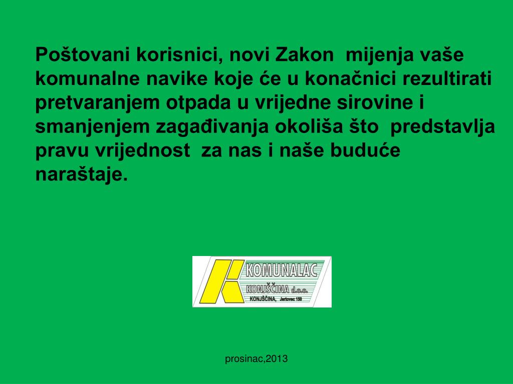 Poštovani korisnici, novi Zakon mijenja vaše komunalne navike koje će u konačnici rezultirati pretvaranjem otpada u vrijedne sirovine i smanjenjem zagađivanja okoliša što predstavlja pravu vrijednost za nas i naše buduće naraštaje. prosinac,2013