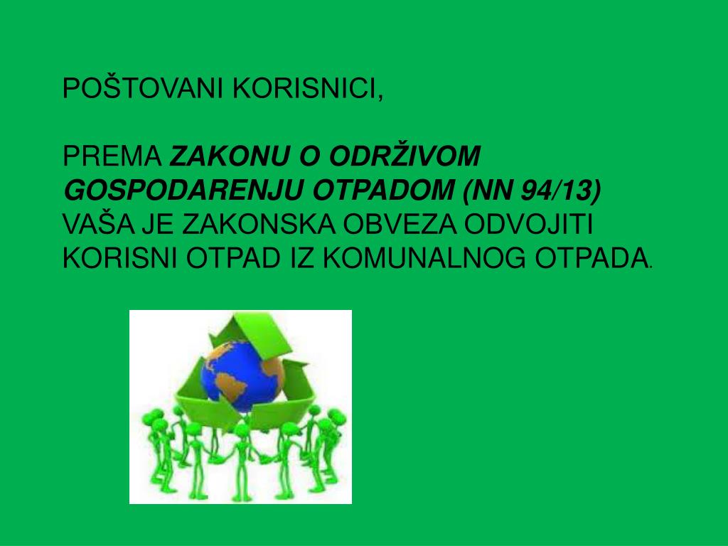 POŠTOVANI KORISNICI, PREMA ZAKONU O ODRŽIVOM GOSPODARENJU OTPADOM (NN 94/13) VAŠA JE ZAKONSKA OBVEZA ODVOJITI KORISNI OTPAD IZ KOMUNALNOG OTPADA.