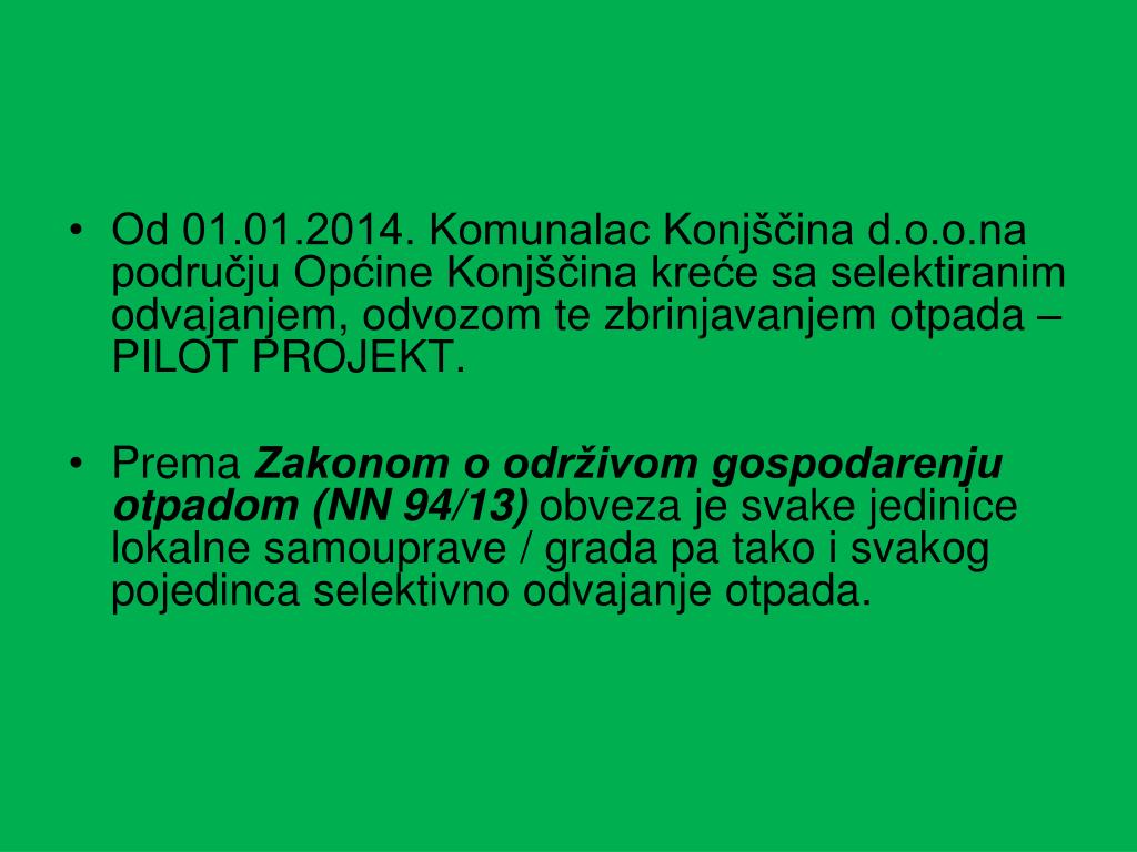 Od 01.01.2014. Komunalac Konjščina d.o.o.na području Općine Konjščina kreće sa selektiranim odvajanjem, odvozom te zbrinjavanjem otpada – PILOT PROJEKT. • Prema Zakonom o održivom gospodarenju otpadom (NN 94/13) obveza je svake jedinice lokalne samouprave / grada pa tako i svakog pojedinca selektivno odvajanje otpada.