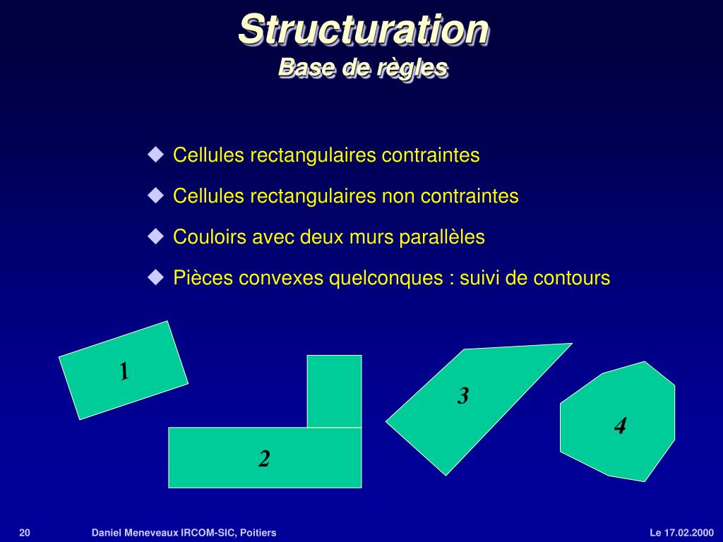 StructurationBase de règles • Cellules rectangulaires contraintes • Cellules rectangulaires non contraintes • Couloirs avec deux murs parallèles • Pièces convexes quelconques : suivi de contours 1 3 4 2