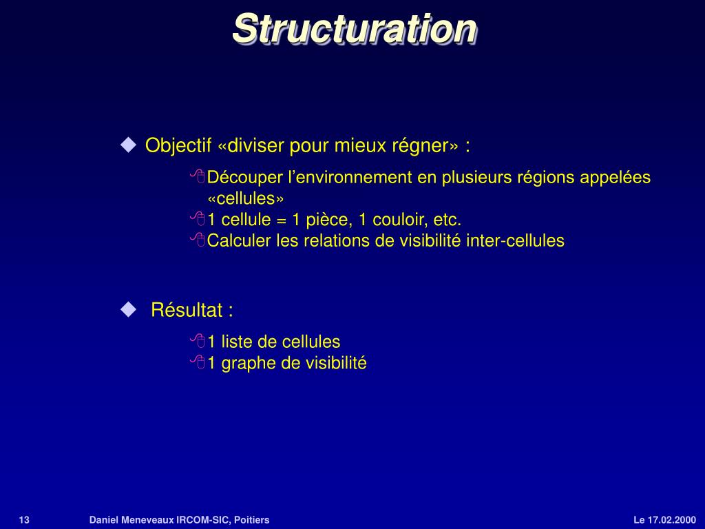Structuration • Objectif «diviser pour mieux régner» : • Découper l’environnement en plusieurs régions appelées «cellules» • 1 cellule = 1 pièce, 1 couloir, etc. • Calculer les relations de visibilité inter-cellules • Résultat : • 1 liste de cellules • 1 graphe de visibilité