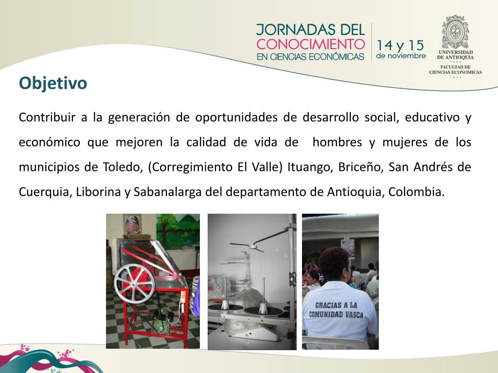Objetivo Contribuir a la generación de oportunidades de desarrollo social, educativo y económico que mejoren la calidad de vida de hombres y mujeres de los municipios de Toledo, (Corregimiento El Valle) Ituango, Briceño, San Andrés de Cuerquia, Liborina y Sabanalarga del departamento de Antioquia, Colombia.