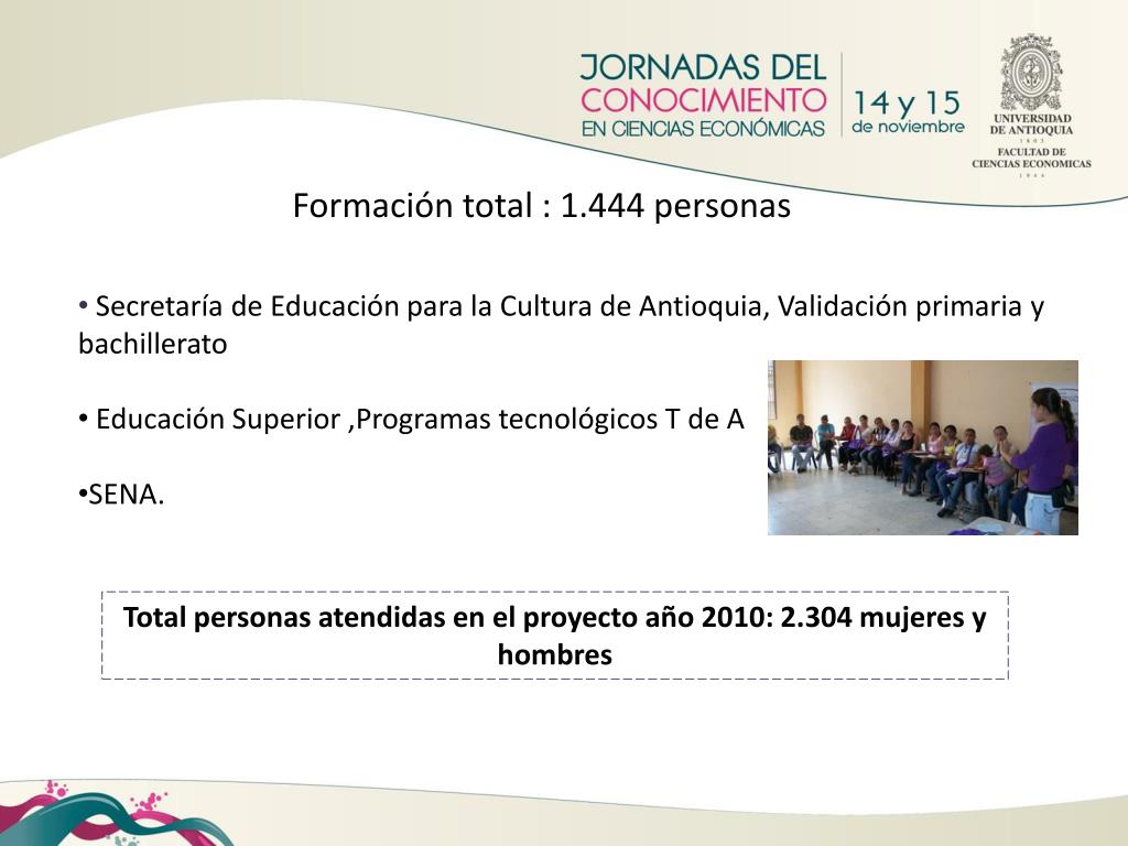 Formación total : 1.444 personas • Secretaría de Educación para la Cultura de Antioquia, Validación primaria y bachillerato • Educación Superior ,Programas tecnológicos T de A • SENA. Total personas atendidas en el proyecto año 2010: 2.304 mujeres y hombres