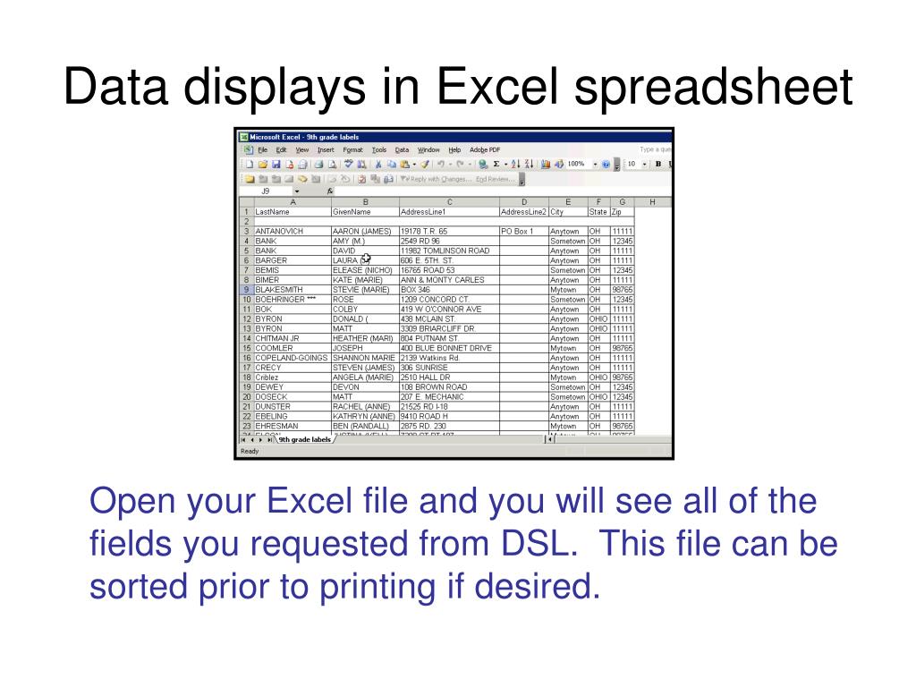 Data displays in Excel spreadsheet Open your Excel file and you will see all of the fields you requested from DSL. This file can be sorted prior to printing if desired.