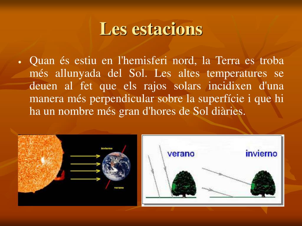 Les estacions • Quan és estiu en l'hemisferi nord, la Terra es troba més allunyada del Sol. Les altes temperatures se deuen al fet que els rajos solars incidixen d'una manera més perpendicular sobre la superfície i que hi ha un nombre més gran d'hores de Sol diàries.